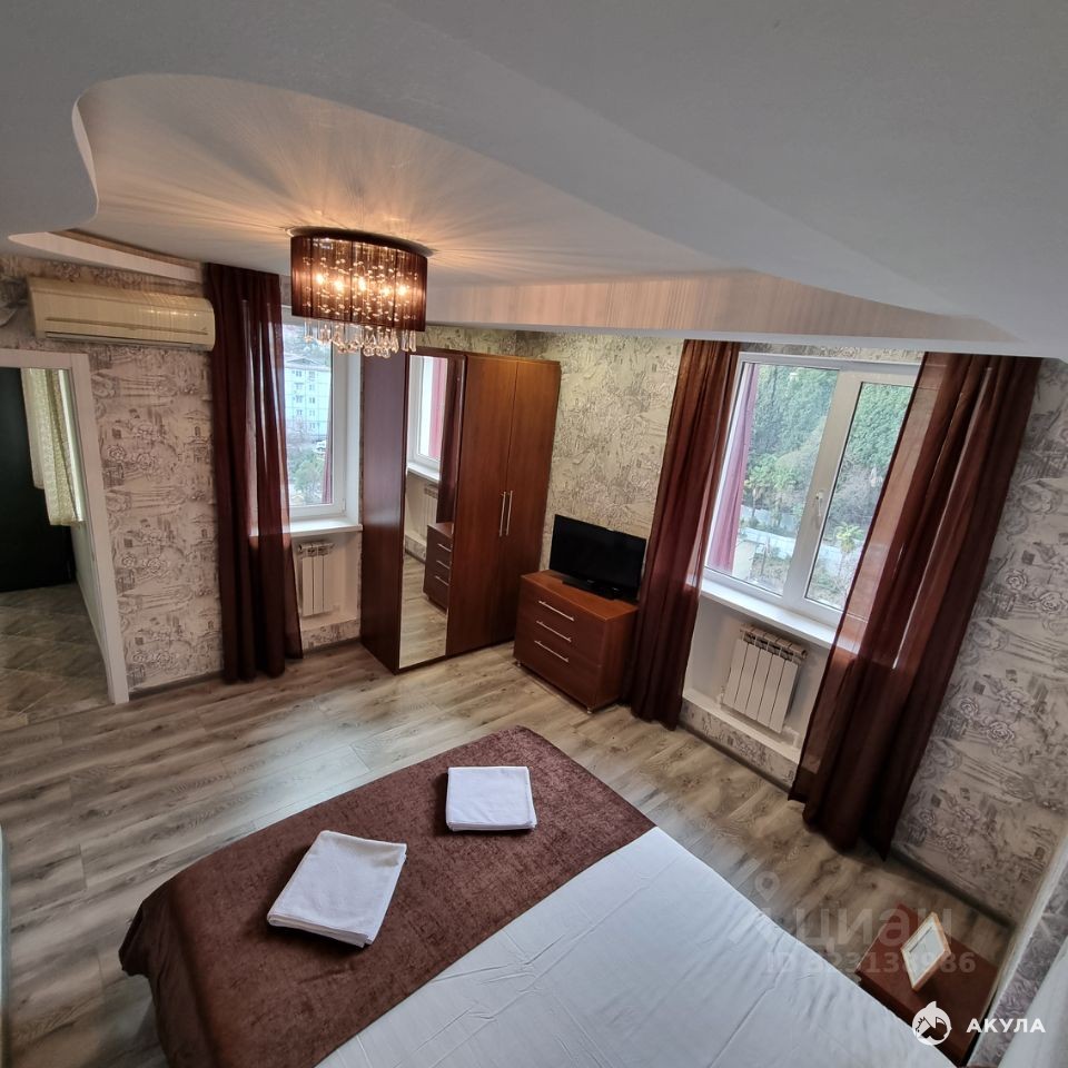 Арт. 88985181. Презентабельный дом бизнес-класса в самом центре города Сочи. Квартира с очень удобной планировкой! В квартире есть всё самое необходимое для комфортного проживания большой семьи: спaльня с витражными окнами, гaрдeробнaя, ванна-джакузи, две кровати с ортопедическими матрасами, шкафы, ЖК телевизор. Полностью укомплектованная большая кухня: плита, вытяжка, холодильник, духовой шкаф, кондиционер. Отличная инфраструктура. Рядом магазины, кафе, садики, школы и все достопримечательности центра города. До моря 5 минут пешком. Заселение без повышения на лето на 11 месяцев. Показы оперативно в любое удобное для ВАС время. Людмила
